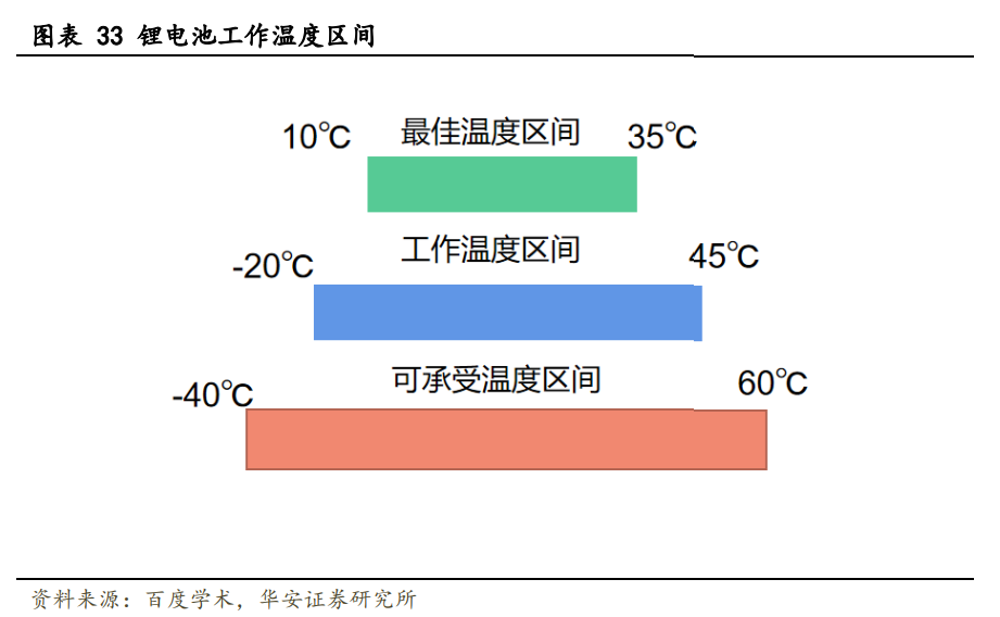 溫控是指通過(guò)加熱或冷卻技術(shù)對(duì)電池的溫度進(jìn)行有效控制和調(diào)節(jié)的過(guò)程。溫控系統(tǒng) 與電池管理系統(tǒng)配合,對(duì)鋰電池進(jìn)行恒溫控制,使其維持在安全的參數(shù)范圍內(nèi),避免電 池進(jìn)入熱失控狀態(tài)。鋰電池安全性、容量衰減受溫度影響較大。根據(jù)研究表明,鋰電池 最佳溫度區(qū)間為 10-35℃,過(guò)度的高低溫都會(huì)對(duì)鋰電池壽命和安全性產(chǎn)生影響。