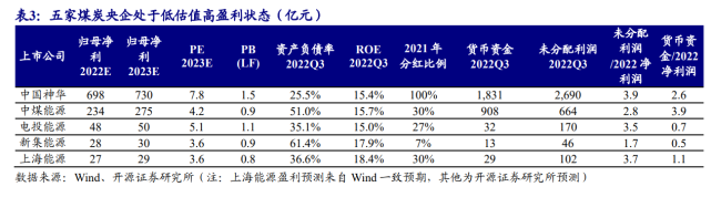 五家煤炭央企具備提估值基礎(chǔ)。煤炭行業(yè)共有五家央企,分別為中國(guó)神華(隸屬?lài)?guó)家能源投資集團(tuán))、中煤能源(隸屬中煤能源集團(tuán))、電投能源(隸屬?lài)?guó)家電力投資集團(tuán))、新集能源(隸屬中煤能源集團(tuán))和上海能源(隸屬中煤能源集團(tuán))。五家煤炭央企中,除中國(guó)神華估值相對(duì)更高外,其他估值普遍較低,中煤能源集團(tuán)旗下三家上市公司市凈率均處于破凈狀態(tài)。從凈資產(chǎn)收益率看,五家煤炭央企2022年前三季度ROE均超過(guò)15%,均處于高盈利狀態(tài)。從貨幣資金和未分配利潤(rùn)看,中國(guó)神華、中煤能源、電投能源均有較多未分配利潤(rùn),具備高分紅基礎(chǔ)。截至2022年三季度,中國(guó)神華未分配利潤(rùn)/2022E凈利潤(rùn)、貨幣資金/2022E凈利潤(rùn)分別為3.9和2.6,未分配利潤(rùn)和貨幣資金均遠(yuǎn)超2022年凈利潤(rùn),2022年或?qū)⒕S持2021年的100%分紅比例,對(duì)應(yīng)當(dāng)前股價(jià),股息率超過(guò)12%,高股息率下,中國(guó)神華仍具備提估值基礎(chǔ)。截至2022年三季度,中煤能源未分配利潤(rùn)/2022E凈利潤(rùn)、貨幣資金/2022E凈利潤(rùn)分別為2.8和3.9,中煤能源在手貨幣資金充裕,2021年分紅比例為30%,2022年存在提高分紅比例的可能,若2022年分紅比例達(dá)到60%,對(duì)應(yīng)當(dāng)前股價(jià),股息率與中國(guó)神華相當(dāng),而其PE/PB估值明顯偏低,且PB已低于1倍,存在大幅提估值可能。截至2022年三季度,電投能源未分配利潤(rùn)/2022E凈利潤(rùn)、貨幣資金/2022E凈利潤(rùn)分別為3.5和0.7,電投能源未分配利潤(rùn)較多,但貨幣資金相對(duì)偏少,主因公司在建綠電項(xiàng)目較多,綠電轉(zhuǎn)型理應(yīng)為公司帶來(lái)更高的估值。