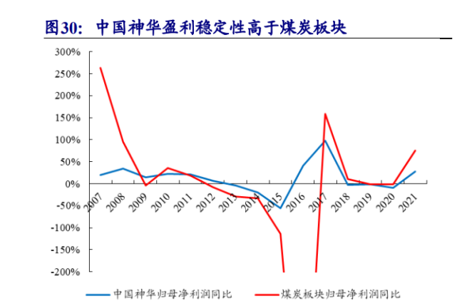 2020年以前,中國(guó)神華估值始終低于煤炭板塊。中國(guó)神華以煤炭產(chǎn)品為基礎(chǔ),形成了煤炭“生產(chǎn)——運(yùn)輸(鐵路、港口、航運(yùn))——轉(zhuǎn)化(發(fā)電及煤化工)”一體化運(yùn)營(yíng)模式,具有鏈條完整、協(xié)同高效、安全穩(wěn)定、低成本運(yùn)營(yíng)優(yōu)勢(shì)。中國(guó)神華體量較大,受益于“煤電路港航化”一體化經(jīng)營(yíng)模式,中國(guó)神華經(jīng)營(yíng)穩(wěn)健性高于行業(yè),業(yè)績(jī)相對(duì)穩(wěn)定。從2010-2020年煤炭行業(yè)和中國(guó)神華的估值對(duì)比中可以看出,中國(guó)神華PE始終低于整個(gè)煤炭板塊,部分年份彈性遠(yuǎn)不及整個(gè)板塊,盈利相對(duì)穩(wěn)定反而不具有強(qiáng)周期性,幾輪周期中,中國(guó)神華彈性較弱,并不是煤炭板塊優(yōu)選標(biāo)的。