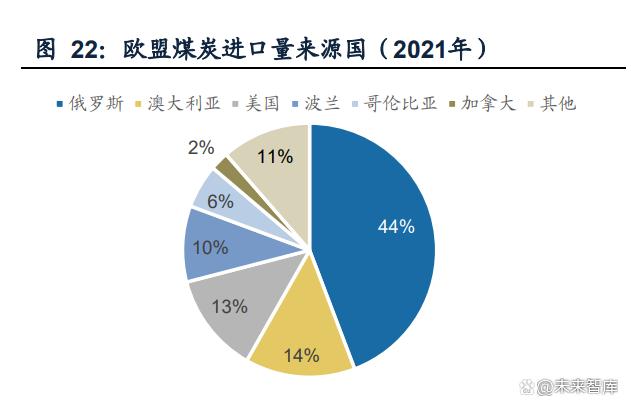 歐盟化石能源進(jìn)口高度依賴俄羅斯,2021年歐盟煤炭、天然氣進(jìn)口量中分別44%、 41%來自俄羅斯,俄烏沖突導(dǎo)致歐洲面臨能源價(jià)格和供應(yīng)的雙重危機(jī)。長遠(yuǎn)來看, 歐盟實(shí)現(xiàn)能源獨(dú)立將從兩方面著手:一是多元化進(jìn)口天然氣氣源,二是加速能源轉(zhuǎn) 型,提高能效,減少對化石能源的依賴,歐盟對煤炭的需求或?qū)⒊掷m(xù)下降。 煤炭:歐盟的煤炭供給量逐年下降至2021年的4.87億噸,較2000年的8.31億噸減少 41.4%,同時(shí)同步減少煤炭本土產(chǎn)量和進(jìn)口量,對外依存度保持在20%~25%。從煤 炭進(jìn)口來源看,歐盟煤炭前三大進(jìn)口國是俄羅斯(占比44%)、澳大利亞(占比14%)、 美國(占比13%);德國和波蘭為本土的產(chǎn)煤大國,合計(jì)產(chǎn)量占?xì)W盟總產(chǎn)量的70%。