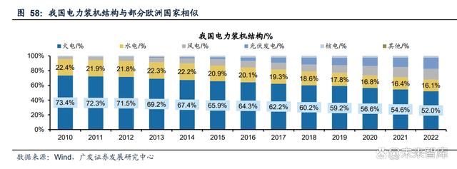 部分歐洲國家與我國電力結(jié)構(gòu)相似,能源轉(zhuǎn)型過程值得借鑒。從我國電力裝機結(jié)構(gòu)來看,過去我國以傳統(tǒng)電源火電、水電為主,2010年兩者裝機占比96%,風光等可 再生能源逐漸成為發(fā)展重點,水電、火電裝機占比下降,2022年火電裝機占比52%, 水電開發(fā)已進入后半程增量有限,風光成為新增裝機主力,這與部分歐洲國家如德 國、波蘭頗為相似,2022年德國煤電發(fā)電量占比已經(jīng)降至31%,風光發(fā)電量占比提 升至32%,其能源轉(zhuǎn)型走在我國之前。隨著我國提出雙碳目標,風光占比提升成為 必然趨勢,德國等歐洲國家能源轉(zhuǎn)型過程中的經(jīng)驗對我國有重要的借鑒意義。