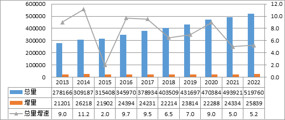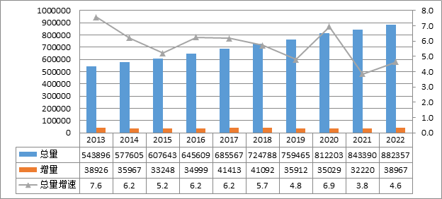 2022年,全國(guó)電網(wǎng)220千伏及以上變電設(shè)備容量共51.98億千伏安,同比增長(zhǎng)5.2%;220千伏及以上輸電線路回路長(zhǎng)度共88.2萬(wàn)千米,同比增長(zhǎng)4.6%。