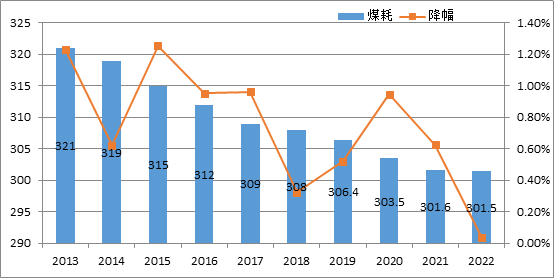 據中電聯(lián)快報數(shù)據,2022年全國6000千瓦及以上電廠供電標準煤耗301.5克/千瓦時,同比降低0.1克/千瓦時,較2013年下降了19.5克/千瓦時。