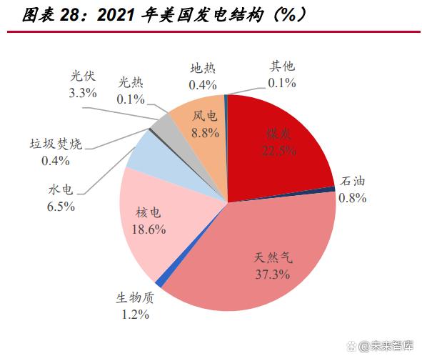 核電發(fā)電量占比穩(wěn)定。在美國發(fā)電結(jié)構(gòu)中,1990年以來核電一直維持在20% 左右水平。天然氣發(fā)電成本相對較低,21 世紀(jì)頁巖氣革命再度夯實天然氣 成本優(yōu)勢,天然氣發(fā)電比例快速增長。近年來天然氣價格波動明顯,以及電 源清潔型的重視程度提升,光伏風(fēng)電成本的快速下降,其占比逐漸提升。