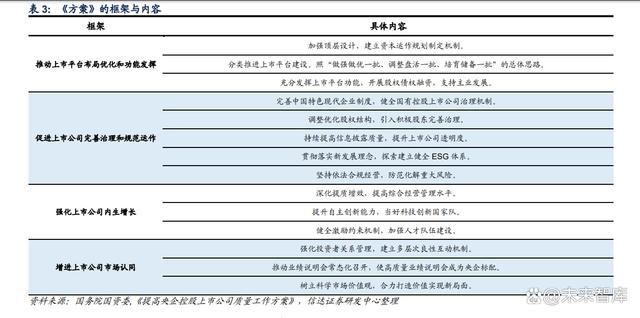 在 2022 年,《國(guó)企改革三年行動(dòng)方案》的收官之年,國(guó)資委提出了《提高央企控股上市公 司質(zhì)量工作方案》(下稱《方案》),這開(kāi)啟了新一輪的央企改革?!斗桨浮访鞔_了提高央 企上市公司質(zhì)量的指導(dǎo)思想和整體思路,要求中央企業(yè)要做好三個(gè)方面的統(tǒng)籌平衡,即堅(jiān)持 做優(yōu)存量與做精增量結(jié)合;堅(jiān)持價(jià)值創(chuàng)造與價(jià)值實(shí)現(xiàn)兼顧;堅(jiān)持依法合規(guī)與改革創(chuàng)新并重。 《方案》從推動(dòng)上市平臺(tái)布局優(yōu)化和功能發(fā)揮、促進(jìn)上市公司完善治理和規(guī)范運(yùn)作、強(qiáng)化上 市公司內(nèi)生增長(zhǎng)和創(chuàng)新發(fā)展、增進(jìn)上市公司市場(chǎng)認(rèn)同和價(jià)值實(shí)現(xiàn)等四個(gè)實(shí)施方面,提出 14 項(xiàng)具體工作舉措。