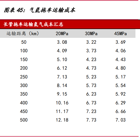 氣氫拖車是目前國內(nèi)最成熟的氫氣運輸形式,我國氫氣管束式集裝箱和氫氣長管 拖車大多采用鋼制大容積無縫高壓氣瓶和鋼制內(nèi)膽碳纖維環(huán)向纏繞氣瓶,工作壓力通 常為 20Mpa,單次運輸氫氣質(zhì)量小,運輸效率低,適用于 200 公里以內(nèi)的短距離運輸。 綜合市場上管束式氫氣集裝箱的平均輸氫量,假設(shè) 20/30/45MPa 管束式集裝箱最大可 運輸氫氣質(zhì)量 340/650/950 千克,管束式集裝箱費用 60/70/80 萬,單位壓縮電耗 2/4.5/6kWh/kg,則運距 500 公里的運輸成本高達 7 元/kg 以上。