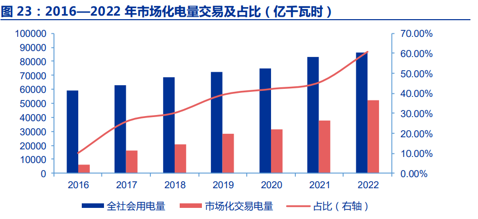 電力交易業(yè)務(wù)是電力市場化最直接收益的業(yè)務(wù)。由于電力市場的設(shè)計復(fù)雜,各地交易 規(guī)則、品種不一,同時也要求對整個電力系統(tǒng)的運行規(guī)律有深刻理解,是高度專業(yè)化的業(yè) 務(wù),電力交易決策本身對于電力市場參與者的收益造成較大影響。 市場化售電規(guī)模有快速擴張潛力。根據(jù)中電聯(lián)相關(guān)數(shù)據(jù),2022 年我國市場化交易電量 規(guī)模達到 5.25 萬億千瓦時,占全社會總用電量的規(guī)模已超過 60%,考慮到優(yōu)先購用電,直 觀看起來售電規(guī)模增長空間有限。但實際上:(1)我國目前市場化交易電量大部分仍通過 電網(wǎng)代理購電,直接購電以及通過售電公司購電比例較低;(2)我國電力現(xiàn)貨市場才開始 推廣,雖然各地要求中長期電量占比要達到 70%—90%以上,但由于絕大多數(shù)省份現(xiàn)貨市 場均采用全電量結(jié)算,因此實際的現(xiàn)貨交易量可能會接近全社會用電量。以廣東省為例, 2022 年全省本地機組發(fā)電量 5844 億千瓦時,中長期交易電量 2871 億千瓦時,現(xiàn)貨市場 總交易量達 3801 億千瓦時。
