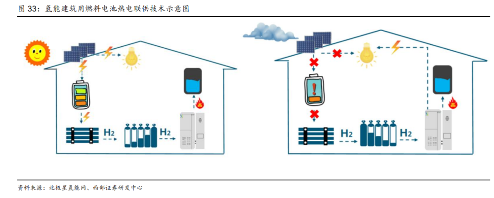 氫建筑應用仍處于導入階段,未來存在較大市場空間。氫能建筑,是近年發(fā)展起來的一種綠色建筑新理念。它以氫能完全或部分替代市政電網、天然氣等傳統(tǒng)能源,滿足建筑對冷、 熱、電、生活熱水等各種能源的需求,在提高建筑用電可靠性的同時,還有助于優(yōu)化國內 的能源結構、降低電網整體投資和減少問題氣體排放。 目前全球建筑供熱和電力需求約占全球能源需求的 1/3。全球多個國家積極探索氫能在建 筑領域應用,利用氫氣通過發(fā)電、直接燃燒、熱電聯(lián)產(CHP)等形式為居民住宅或商業(yè) 區(qū)提供電熱水冷多聯(lián)供。如氫可與天然氣混合(氫氣摻混比例為 0~20%),通過基于燃氣 輪機或燃料電池的 CHP 技術,利用現(xiàn)有建筑和能源網絡基礎設施提供靈活性和連續(xù)性的 熱能、電力供應,從而取代化石燃料 CHP。此外,100% 的純氫可通過氫鍋爐用于建筑 供熱,但氫氣價格需低至 1.5~3.0 美元/kg 時,才能與天然氣鍋爐和電動熱泵競爭。而對 于分布式供暖,氫能是少數(shù)幾種可以與天然氣競爭的低碳替代品,隨著制氫成本和氫鍋爐、 燃料電池成本的下降,以及氫氣利用現(xiàn)有天然氣管道輸送能力的提升,預計到 2030 年, CHP 中氫鍋爐與氫燃料電池的成本為 900~2000 美元/(戶·年),建筑熱電聯(lián)供的氫能 需求量為 3 萬~ 9 萬 t/年。