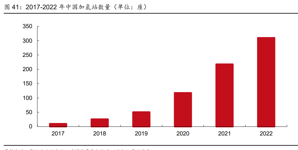 加氫站布局加快,逐漸形成網(wǎng)絡(luò)。加氫站等基礎(chǔ)設(shè)施是否完善是影響消費(fèi)者購(gòu)買氫燃料電 池汽車熱情的主要因素。隨著國(guó)內(nèi)氫燃料電池汽車?yán)塾?jì)銷量增加,中石化、中石油等能源 央企不斷加大加氫基礎(chǔ)設(shè)施的投資和建設(shè)力度,國(guó)內(nèi)加氫站數(shù)量呈現(xiàn)快速增長(zhǎng)趨勢(shì)。截至 2022 年底,我國(guó)加氫站累計(jì)建成數(shù)量達(dá)到 274 座。根據(jù) 2020 年中國(guó)汽車工程學(xué)會(huì)發(fā)布 的《節(jié)能與新能源汽車技術(shù)路線圖 2.0》相關(guān)規(guī)劃,到 2035 年加氫站的建設(shè)目標(biāo)為至少 5000 座,中國(guó)未來(lái)加氫基礎(chǔ)設(shè)施的市場(chǎng)規(guī)模在 2030-2050 年將突破千億。此外,我國(guó)加 氫站建設(shè)參與主體呈現(xiàn)多樣化趨勢(shì),采取規(guī)?;ㄔO(shè)或加油/加氫/加氣站合建等方式來(lái)拓 展加氫基礎(chǔ)設(shè)施網(wǎng)絡(luò),單位加注成本也有望下降。
