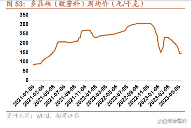 硅料價格持續(xù)下降,新建產(chǎn)能規(guī)模龐大,有望推動光伏裝機進(jìn)一步增長。2022 年 12 月開始,隨著硅料產(chǎn)能的逐步釋 放,多晶硅和組件價格開始大幅回落。2023 年 2 月,硅料價格出現(xiàn)輕微反彈,主要系需求回暖+開工補庫所致,目前 已重新進(jìn)入下行通道。截至 2023 年 5 月 17 日,多晶硅(致密料)價格為 143 元/千克,相較 2022 年 11 月 30 日的 高點 295 元/千克下降 51.53%;單面單晶 PERC 組件價格(182mm)為 1.66 元/瓦,相較 2022 年 11 月 23 日的高 點 1.97 元/瓦下降 15.74%。硅業(yè)分會表示,2023 年國內(nèi)多晶硅產(chǎn)量保守估計有 146 萬噸,加上進(jìn)口多晶硅可達(dá) 156 萬噸,這些硅料已經(jīng)足夠 600GW 光伏裝機,已遠(yuǎn)超 2023 年的全球光伏裝機量需求,過剩的產(chǎn)能有望推動硅料和組 件價格進(jìn)一步下行,提升運營商的裝機意愿。