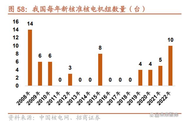 2021 年國家首次提出“積極有序發(fā)展核電”。同年,我國新增 5 臺核準(zhǔn)機組;2022 年新核準(zhǔn) 10 臺機組,核電審批和 開工節(jié)奏明顯提速。根據(jù)世界核協(xié)會,截至 2023 年 5 月,我國在運+在建機組總數(shù)達(dá)到 77 臺,已經(jīng)超過法國,僅次 于美國。預(yù)計在未來 5 年間,中國將進(jìn)一步加快擴大裝機規(guī)模,保持每年 6 至 8 臺核電機組的核準(zhǔn)開工節(jié)奏。