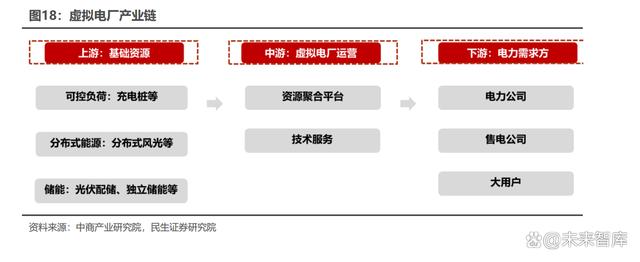 虛擬電廠產(chǎn)業(yè)鏈包括:上游基礎(chǔ)資源、中游虛擬電廠運(yùn)營(yíng)、下游電力需求方。 上游基礎(chǔ)資源由可控負(fù)荷、分布式能源與儲(chǔ)能構(gòu)成;中游是提供運(yùn)營(yíng)服務(wù)與技術(shù)支 持的虛擬電廠運(yùn)營(yíng)平臺(tái);下游則由電力公司、售電公司、工業(yè)企業(yè)、商業(yè)用戶等電 力需求方構(gòu)成。