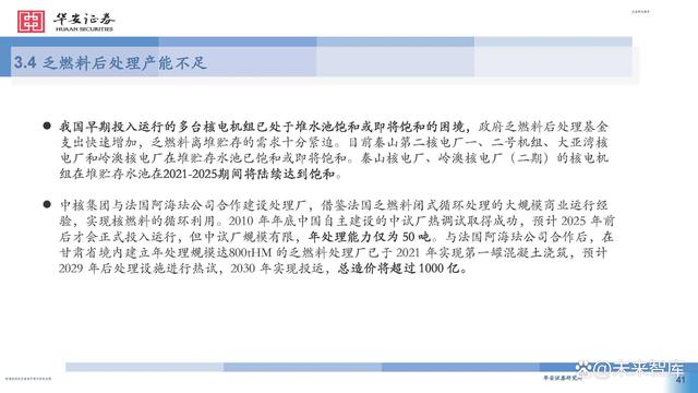 假設乏燃料的產(chǎn)量與乏燃料后處理廠建設完成后的處理能力達到平衡,則到 2035 年國內(nèi)應該具備年 處 理 2760 噸乏燃料能力。按照中法兩國商談中的 800 噸/年后處理廠的處理能力,假設一個后處理廠 的處理能力為 800 噸/年,則估算我國需要建設 3—4 個后處理廠。