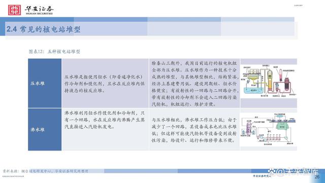 目前世界主流核電站皆采用第二代或第三代核電技術。其中,第二代和第三代的 主要核電堆型包括壓力堆和沸水堆等,在安全性和經(jīng)濟性上較前一代都有提升。第四代核電技術以在安全 性、經(jīng)濟性、核廢物處理、防止核擴散上更為出色,代表堆型包括鈉冷快堆、鉛冷快堆、氣冷快堆、超高 溫氣冷堆等,目前主要研發(fā)試驗階段,商業(yè)化預計在2030年左右實現(xiàn)。