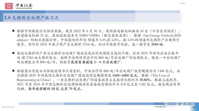 根據(jù)中國核能行業(yè)協(xié)會數(shù)據(jù),截至 2022 年 6 月 30 日,我國在運核電機組共 54 臺(不含臺灣地區(qū)), 在建核電機組 23 臺,在運裝機容量為 55805.74MWe(額定裝機容量)。根據(jù)《bp Energy Outlook:2020 edition》的相關數(shù)據(jù)分析,中國核電的年均 增速為 5.4%至 6.0%,按 5.4%的增速對乏燃料產(chǎn)出做保守 估算,預計到 2035 年最少將產(chǎn)生乏燃料 2764 噸,而以中值估算的話,這一數(shù)字是 3040 噸。