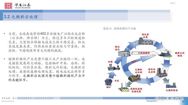 目前,全球在運營的400多座核電廠以輕水反應堆 (壓水堆、沸水堆)為主,經(jīng)過多年不斷改進和 完善,大型輕水堆核電技術已經(jīng)日趨完善,但從 長遠發(fā)展來看,仍然面臨著安全性與可靠性、經(jīng) 濟性、可持續(xù)性等重大問題的挑戰(zhàn)。 核燃料循環(huán)產(chǎn)業(yè)是整個核工業(yè)產(chǎn)業(yè)鏈的一環(huán),也 是核能發(fā)展的大動脈,包括鈾礦開采、冶煉、轉(zhuǎn) 化純化、同位素分離、燃料元件制造、乏燃料后 處理、放射性廢物處理處置、核電站反應堆等多 個環(huán)節(jié)。乏燃料后處理為整個核燃料循環(huán)產(chǎn)業(yè)中 的關鍵環(huán)節(jié)。