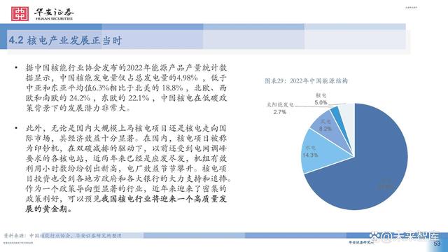 據(jù)中國核能行業(yè)協(xié)會發(fā)布的2022年能源產(chǎn)品產(chǎn)量統(tǒng)計數(shù) 據(jù)顯示,中國核能發(fā)電量僅占總發(fā)電量的4.98% ,低于 中亞和東亞平均值6.3%相比于北美的 18.8% ,北歐、西 歐和南歐的 24.2% ,東歐的 22.1% ,中國核電在低碳政 策背景下的發(fā)展?jié)摿Ψ浅4蟆?此外,無論是國內(nèi)大規(guī)模上馬核電項目還是核電走向國 際市場,其經(jīng)濟效益十分顯著。在國內(nèi),核電項目被稱 為印鈔機,在雙碳減排的驅(qū)動下,以前還受到電網(wǎng)調(diào)峰 要求的各核電站,近兩年來已經(jīng)是應發(fā)盡發(fā),機組有效 利用小時數(shù)紛紛創(chuàng)出新高,電廠效益節(jié)節(jié)攀升。核電項 目投資也受到各地方政府和各大銀行的大力支持和追捧。 作為一個政策導向型顯著的行業(yè),近年來迎來了密集的 政策利好,可以預見我國核電行業(yè)將迎來一個高質(zhì)量發(fā) 展的黃金期。