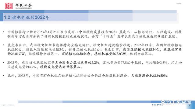 中國核能行業(yè)協(xié)會2023年4月26日在京發(fā)布《中國核能發(fā)展報告2023》藍皮書,從核電運行、工程建設、科技 創(chuàng)新等方面總結(jié)分析了當前我國核能行業(yè)發(fā)展狀況,并對“十四五”及中長期我國核能發(fā)展前景進行展望。藍皮書顯示,我國核電機組長期保持安全穩(wěn)定運行,核電機組建設穩(wěn)步推進。2022年以來,我國新核準核電 機組10臺,新投入商運核電機組3臺,新開工核電機組6臺。截至目前,我國在建核電機組24臺,總裝機容量 約26.81GW,繼續(xù)保持全球第一。商運核電機組54臺,總裝機容量56.82GW,位列全球第三。 2022年,我國核電總裝機容量占全國電力裝機總量的2.2%,發(fā)電量為4177.8億千瓦時,同比增加2.5%,約占全國總發(fā)電量的4.7%,核能發(fā)電量達到世界第二。 此外,2022年,中國有37臺機組在世界核電運營者協(xié)會的綜合指數(shù)達到滿分,占世界滿分機組的50%。