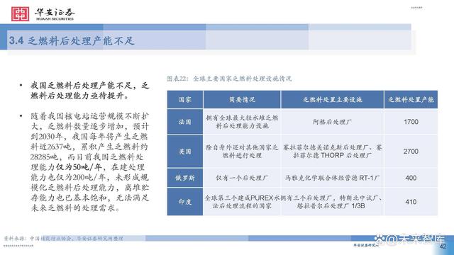 2007年,我國確定了符合國情的閉式燃料循環(huán)路線。乏燃料后處理屬于高精尖技術,處理廠建設需耗時10 年。目前,法國、日本、印度等國乏燃料后處理產(chǎn)能已可覆蓋最新年產(chǎn)生量,而我國僅有中核四0四有限 公司于2010年投產(chǎn)的中試廠產(chǎn)能為50tHM/年。 隨著壓水堆裝機容量快速增長,我國乏燃料的總量也將迅速增長。當前,我國乏燃料后處理基礎研究與俄 羅斯、美國、法國等國仍存差距,后處理關鍵設備如剪切機、溶解器等仍有待進一步研發(fā),尚未建成商用 后處理廠且不具備相應的運行經(jīng)驗。