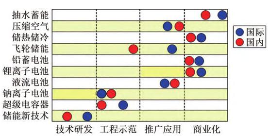 從各類儲(chǔ)能技術(shù)的研發(fā)推廣進(jìn)程看,目前我國(guó)儲(chǔ)能技術(shù)基本上與國(guó)際先進(jìn)水平并跑,壓縮空氣儲(chǔ)能、儲(chǔ)熱儲(chǔ)冷、鉛蓄電池、鋰離子電池、液流電池和鈉離子電池技術(shù)已達(dá)到或接近世界先進(jìn)水平;抽水蓄能、飛輪儲(chǔ)能、超級(jí)電容和儲(chǔ)能新技術(shù)與世界先進(jìn)水平還有一定的差距,如下圖所示。