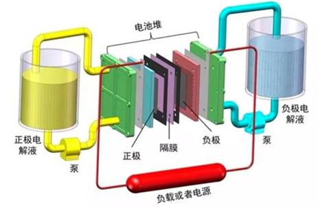 ——工作原理。液流電池通過(guò)離子選擇膜的離子交換將化學(xué)能轉(zhuǎn)化為電能,離子選擇膜將兩種液體電解質(zhì)分開存儲(chǔ)在不同的罐中,利用兩種化學(xué)溶液進(jìn)行離子交換來(lái)進(jìn)行充放電,其電壓一般在1.0-2.2V之間。與其它電池相似,液流電池的功率與隔膜面積成正比,而儲(chǔ)存能量的多寡和溶液儲(chǔ)存容量成正比。