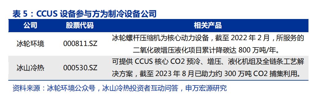 2)藍氫:在化石能源制氫基礎(chǔ)上增添碳捕集設(shè)備,至2025 年需增設(shè)年捕集量2000 萬噸的CCUS 設(shè)備,核心動力裝置為螺桿壓縮機,廠商主要包括冰輪環(huán)境、冰山冷熱;