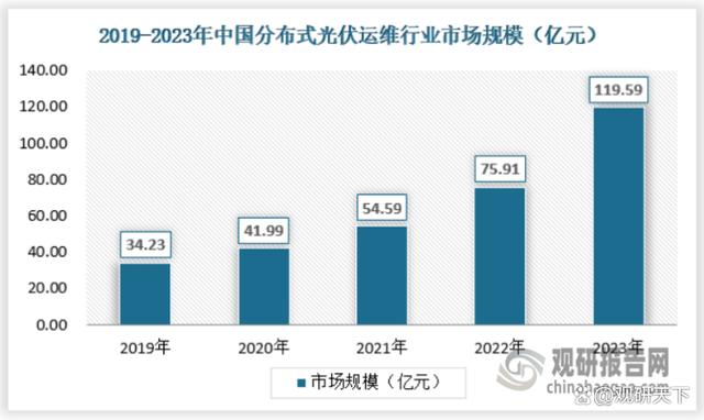 2023年分布式光伏運(yùn)維市場(chǎng)達(dá)到119.59億元。2023年新增分布式光伏裝機(jī)容量約為96GW,同比增長(zhǎng)88.39%,2023年累計(jì)分布式光伏裝機(jī)容量約為254W,同比增長(zhǎng)60.88%,因此2023年市場(chǎng)規(guī)模較2022年增長(zhǎng)57.53%,具體如下: