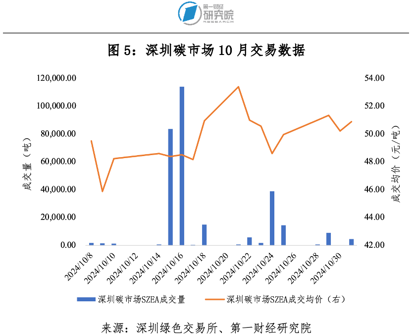 10月深圳碳市場碳排放配額(SZEA)成交量29.32萬噸,成交額1432.74萬元。期間,最高價56.00元/噸,最低價45.00元/噸,成交均價48.87元/噸。10月最后一個交易日收盤價50.90元/噸,較9月最后一個交易日收盤價49.98元/噸上漲1.84%。截至10月31日,SZEA累計成交量7712.29萬噸,累計成交額20.48億元。
