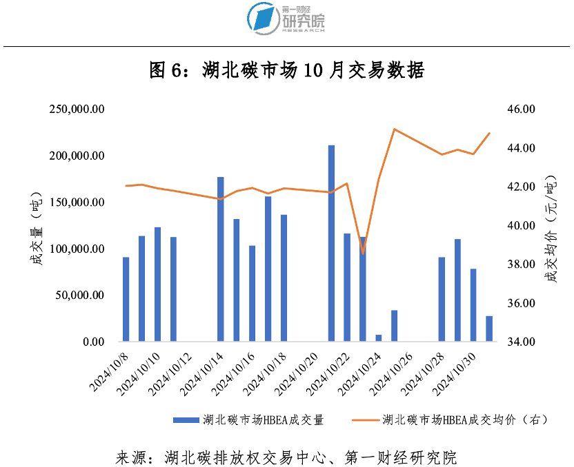 10月湖北碳市場碳排放配額(HBEA)交易成交量193.82萬噸,成交額8143.04萬元。期間,最高價45.50元/噸,最低價38.00元/噸,成交均價42.01元/噸。10月最后一個交易日收盤價44.78元/噸,較9月最后一個交易日收盤價42.16元/噸上漲6.21%。截至10月31日,HBEA(不包括遠期和拍賣)累計成交量1.34億噸,累計成交額33.35億元。
