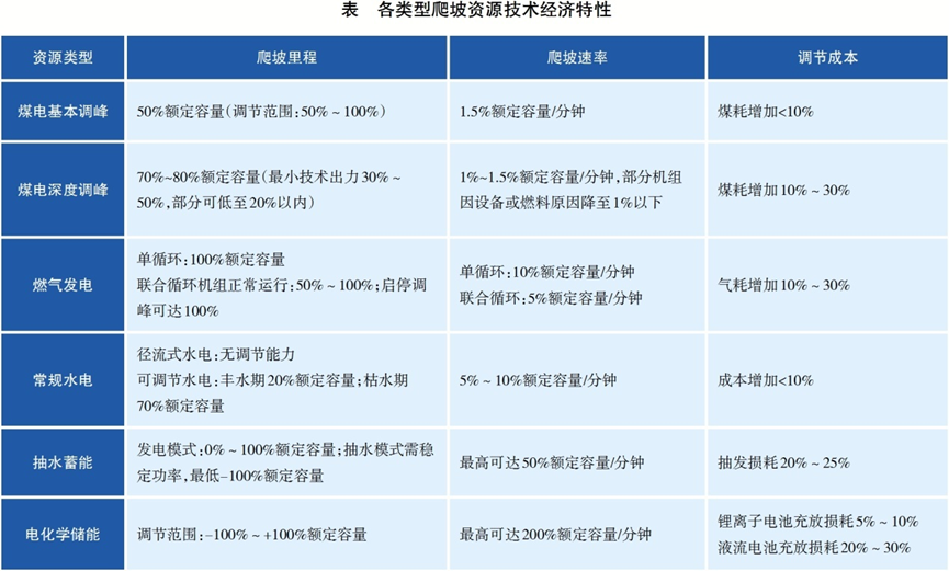 系統(tǒng)爬坡能力需基于各類型爬坡資源技術(shù)經(jīng)濟(jì)特性開展分析。從爬坡速率和里程等調(diào)節(jié)性能看,電化學(xué)儲能和抽水蓄能普遍優(yōu)于煤電、氣電等火電電源,可調(diào)節(jié)水電枯水期的調(diào)節(jié)能力優(yōu)于豐水期;從調(diào)節(jié)成本看,煤電基本調(diào)峰和常規(guī)水電調(diào)節(jié)成本較低,氣電調(diào)峰次之,抽水蓄能與電化學(xué)儲能的成本取決于抽發(fā)電價(jià)差與轉(zhuǎn)換效率,煤電深度調(diào)峰成本較高。